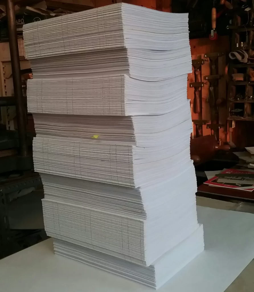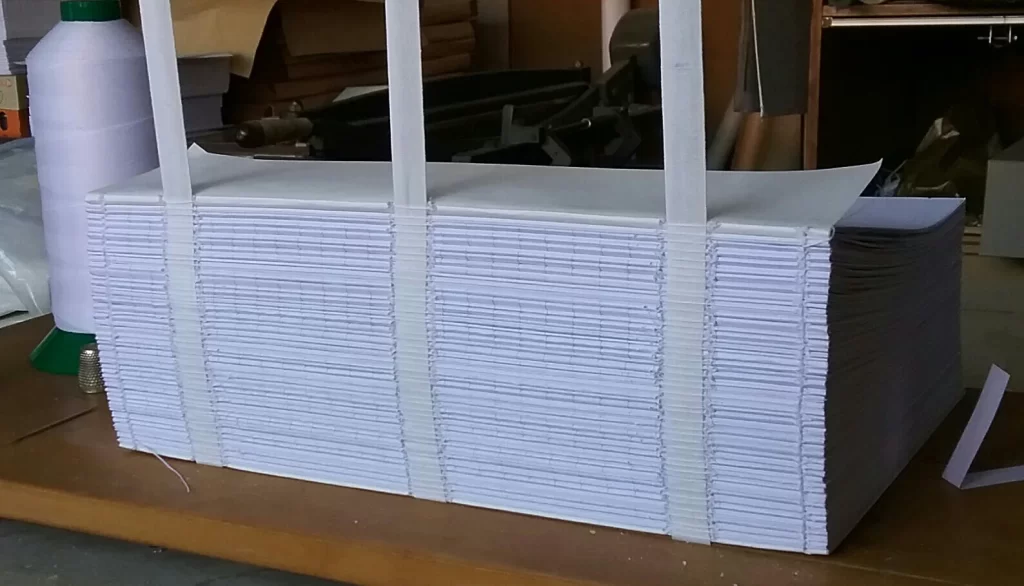 I fascicoli vengono cuciti rigorosamente a mano e su fettuccia con filo refe.